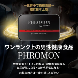 PHROMONは、オーストラリアのEBERS社が提供する男性向け健康食品・アンチエイジング製品です。「青春を取り戻す、男の電源フォロモン」というキャッチフレーズで、男性の健康と活力をサポートすることを目的としています。