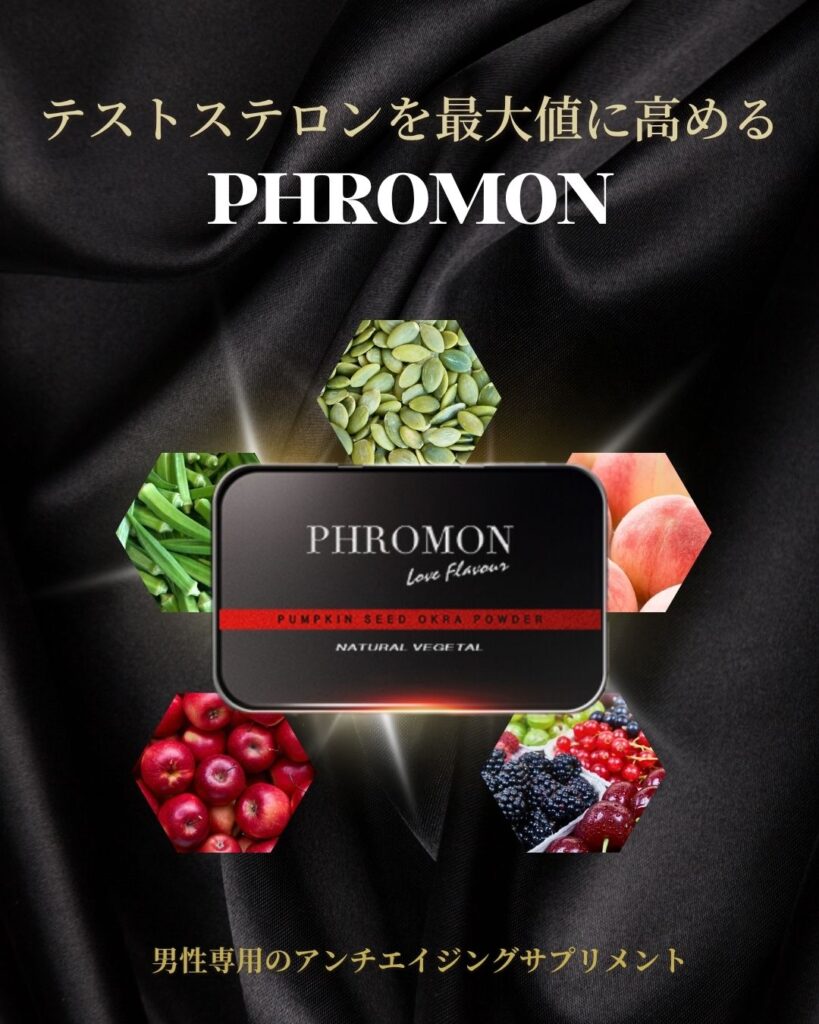 そして、生活習慣の改善と並行して、足りない栄養素を天然植物成分100%のサプリメントPHROMONで内側から補うことも、男性の健康と活力を維持するひとつの方法です。